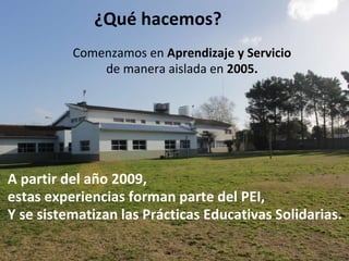 Este documento resume los proyectos de aprendizaje y servicio que se llevan a cabo en la Escuela Argentina Danesa "Alta Mira" en diferentes niveles educativos. Los proyectos incluyen la producción de cuentos para niños internados, educación vial, forestación de espacios verdes, reciclaje y concientización ambiental, y talleres culturales y deportivos. Los proyectos buscan beneficiar a la comunidad local y trabajar en conjunto con diferentes instituciones.