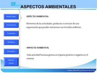 Este documento describe los aspectos e impactos ambientales de las actividades de una organización. Define aspecto ambiental como los elementos de las actividades, productos o servicios que pueden interactuar con el medio ambiente. Explica que toda actividad humana genera impactos ambientales positivos o negativos y proporciona ejemplos de cómo identificar los aspectos e impactos a través del análisis del ciclo de vida de los procesos y operaciones de una empresa.