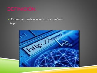 Los protocolos como HTTP y HTTPS establecen normas para la comunicación entre servidores y usuarios en Internet. Cuando un usuario se conecta a Internet, sigue unos pasos: 1) conexión al servidor, 2) petición de información, 3) respuesta del servidor, 4) cierre de la conexión. Los hackers no siempre roban información, también pueden usar sus habilidades para fines positivos, mientras que los crackers se dedican a robar datos de usuarios.