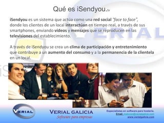 iSendyou es una aplicación que permite a los clientes de establecimientos de hostelería enviar videos y mensajes en tiempo real a las televisiones del local para interactuar y entretenerse, creando un ambiente participativo que aumenta el consumo y fidelidad de los clientes. La aplicación está disponible para Android e iOS y permite a los establecimientos promocionarse a bajo costo mientras empresas pueden anunciarse de forma segmentada.