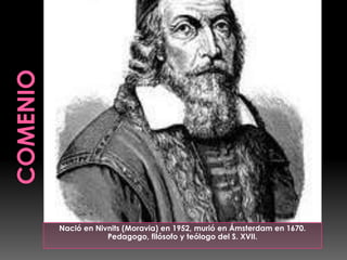 El documento presenta información sobre un pedagogo del siglo XVII. Nació en Moravia en 1632 y murió en Ámsterdam en 1670. Propuso que la educación debe estar disponible para todos y enseñar de una manera acorde a la naturaleza, mediante la observación y los sentidos. Creía que el objetivo de la educación es lograr la paz mundial.