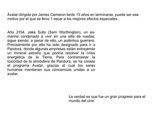 Avatar fue dirigida por James Cameron y tardó 13 años en completarse. La película sigue a Jake Sully, un ex-marine que es enviado a Pandora para investigar un mineral valioso, pero termina cambiando de bando y ayudando a los nativos Na'vi a proteger su planeta. La película revolucionó los efectos visuales y se llevó el Oscar en esa categoría.