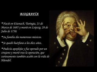 Johann Sebastian Bach nació en 1685 en Alemania y murió en 1750. Fue un compositor y músico muy influyente que recibió sus primeras lecciones musicales de su padre y hermano. Compuso numerosas obras instrumentales y vocales, incluyendo cantatas, misas, pasiones y oratorios. Tuvo una gran influencia en compositores posteriores como Mozart.