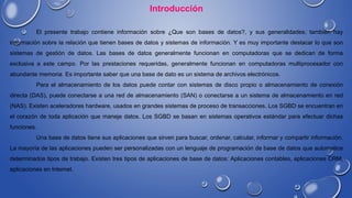 Una base de datos es una colección de información organizada que permite a los programas de computadora seleccionar rápidamente los datos necesarios. Una base de datos es un sistema de archivos electrónicos que permite almacenar información de manera ordenada para diferentes propósitos, como datos de diferentes departamentos de una empresa. Las aplicaciones de bases de datos se usan para buscar, ordenar, calcular e informar datos, y proporcionan seguridad a través de controles de acceso. Un sistema gestor de base de datos es un conjunto de programas que permiten almacen