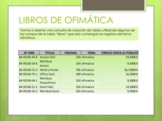 El documento describe varias consultas de bases de datos para manipular tablas y datos sobre libros de ofimática e Internet. Se crea una tabla con los libros del tema ofimática, se añaden libros de Internet a esta tabla y se renombra, se actualiza el precio de los libros, se muestran pedidos agrupados por mes y autor, y se eliminan registros del tema ofimática.