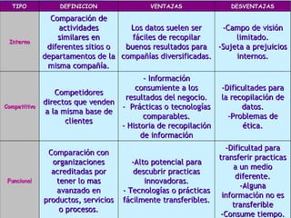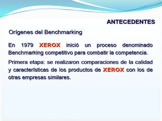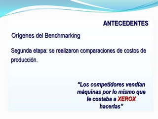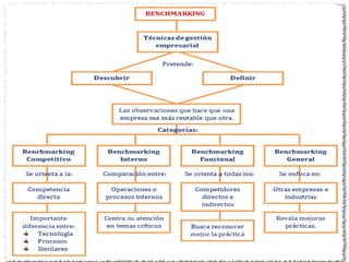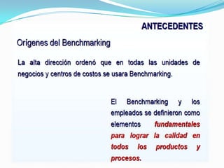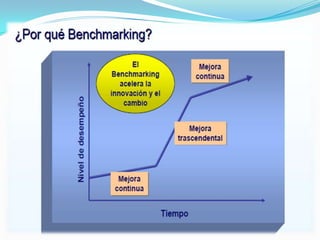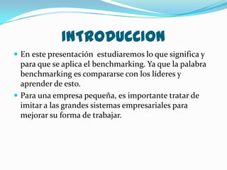 Este documento presenta una introducción al benchmarking, que es el proceso de comparar las prácticas y procesos de una organización con los líderes del sector para identificar áreas de mejora. Explica que el benchmarking es una herramienta importante de mejora continua y detalla sus objetivos, beneficios, pasos y tipos.