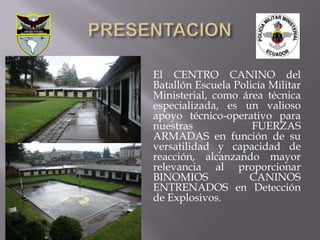 Este documento describe las capacidades y actividades del Centro Canino del Batallón Escuela Policía Militar Ministerial. El Centro Canino entrena binomios caninos para la detección de explosivos, lo que brinda un valioso apoyo a las Fuerzas Armadas. Con el apoyo de organizaciones estadounidenses, los binomios caninos están preparados para realizar búsquedas y detección de explosivos en cualquier lugar. Actualmente, los binomios caninos apoyan la seguridad en la frontera norte, edificios oficiales, aeropu