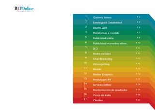 El documento presenta los servicios de una agencia de comunicación online que abarca desde estrategia y creatividad hasta producción audiovisual y marketing digital. Destaca su enfoque en el diseño web, publicidad online, gestión de redes sociales y plataformas a medida, además de incluir casos de éxito que demuestran su efectividad. La agencia también enfatiza la importancia de la monitorización de resultados para optimizar campañas y mejorar la presencia de marca.
