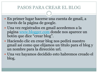 Este documento proporciona instrucciones para crear un blog en Blogger.com. Explica cómo crear una cuenta de Gmail, luego usar esa cuenta para crear un blog en Blogger eligiendo un título y nombre de dominio. También cubre cómo agregar plantillas, diseñar la apariencia y estructura del blog, y agregar entradas y páginas de contenido.