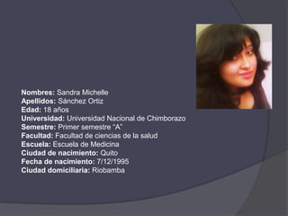 Este documento presenta la información personal de Sandra Sánchez, una estudiante de 18 años de la Universidad Nacional de Chimborazo que cursa el primer semestre de la carrera de medicina. El documento también describe los objetivos de crear un blog para el curso, como aprender sobre blogs, aplicar conocimientos sobre ellos, crear un blog propio y presentarlo, y utilizar blogs para compartir información.