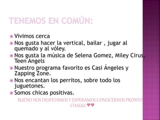 El documento contiene mensajes de varias niñas que se presentan a sí mismas. Les gusta salir con amigas, escuchar música pop, ver programas de televisión, jugar al vóley y fútbol, andar en bicicleta, y pasar tiempo con sus familias y mascotas.
