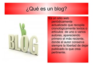 El documento habla sobre cómo crear un blog usando la plataforma Blogger.com. Explica que Blogger permite crear una cuenta gratis con un correo electrónico y contraseña, asignar un nombre y dirección URL al blog, elegir entre diferentes plantillas de diseño, y empezar a publicar contenido o personalizar la apariencia.