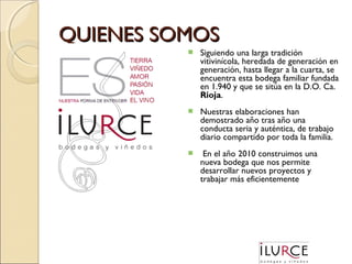 Bodegas y Viñedos Ilurce es una bodega familiar fundada en 1940 en La Rioja que produce una variedad de vinos tintos y rosados premiados. La bodega cuenta con 60 hectáreas de viñedos propios de variedades como tempranillo, garnacha y graciano. Sus vinos incluyen un rosado y tinto jóvenes así como crianzas y reservas añejos elaborados con atención a la tradición pero aplicando también nuevas tecnologías.