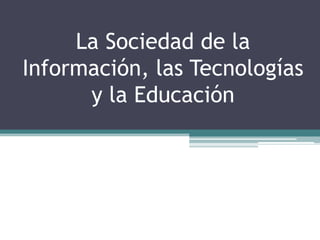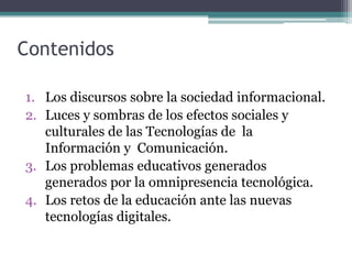 Este documento discute los desafíos de la educación ante las nuevas tecnologías digitales. Explora los discursos sobre la sociedad de la información, las ventajas y desventajas de las tecnologías de la información, y los problemas educativos generados por la omnipresencia tecnológica. Finalmente, destaca los retos de integrar las nuevas tecnologías en la educación y desarrollar habilidades para buscar, seleccionar e interpretar información.