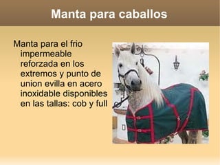 La manta para caballos es impermeable y reforzada en los extremos y puntos de unión con acero inoxidable, y está disponible en tamaños cob y full. La montura vaquera para caballos está hecha a mano con paja de centeno, piel y zalea de ternero nacional, concha y perilla moteada, y agujetas y francaletes de ternera nacional, y evillas pavonadas y manta extribera.