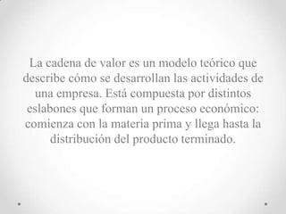 La cadena de valor describe cómo una empresa desarrolla sus actividades a través de distintos eslabones, desde la obtención de materias primas hasta la distribución del producto terminado. Se compone de actividades primarias y de apoyo, y busca maximizar la diferencia entre el valor total creado y el costo de las actividades. La forma en que una empresa gestiona sus actividades de valor refleja su estrategia, historia y enfoque competitivo.