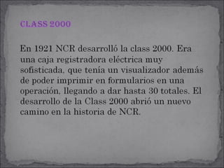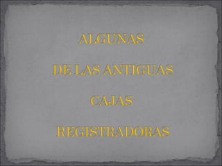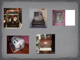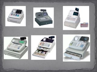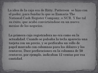 La primera caja registradora fue inventada en 1879 por James Ritty en Ohio, Estados Unidos, para evitar que sus empleados robaran las ganancias de su saloon. Con el tiempo, las cajas registradoras evolucionaron de mecánicas a electrónicas, permitiendo imprimir recibos y facturas de venta. Hoy en día, las cajas registradoras modernas usan software para llevar controles contables y pueden conectarse a impresoras, lectores de códigos de barras y tarjetas de crédito.