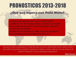 Este documento presenta una serie de conferencias sobre temas económicos y financieros. Incluye conferencias sobre las perspectivas económicas bajo el gobierno de Peña Nieto, las cualidades necesarias para triunfar como profesionista, el ciclo de los negocios y cómo proteger el patrimonio financiero, y un análisis de las tendencias en sectores económicos específicos de México.