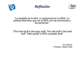 El documento presenta una cita de Tom Malone, presidente de Milliken Mills, en la que afirma que lo tangible es fácil mientras que lo emocional es difícil, y que la calidad total depende en un 90% de las emociones y las personas. A continuación, se enumeran varias herramientas para la gestión del cambio como el análisis de resistencia al cambio, el análisis de posturas de afectados, asegurar la permanencia del cambio con métricas e índices de medida, monitorizar el progreso con reportes sistem