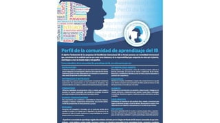 El documento describe los requisitos centrales de CAS (Creatividad, Actividad y Servicio) para el Programa del Diploma. Los estudiantes deben completar experiencias CAS y al menos un proyecto CAS durante 18 meses. CAS fomenta la reflexión y el desarrollo personal en áreas como la creatividad, el servicio a la comunidad, y un estilo de vida saludable. Los estudiantes demuestran los 7 resultados de aprendizaje de CAS a través de una carpeta que documenta sus experiencias y reflexiones.