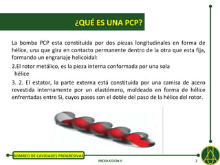 Este documento describe el funcionamiento de las bombas de cavidad progresiva (PCP). Explica que estas bombas constan de un rotor metálico helicoidal que gira dentro de un estator fijo moldeado en forma de doble hélice. Mientras el rotor gira, se forman cavidades de flujo que se desplazan axialmente bombeando el fluido. También analiza los componentes, instalación, ventajas y desventajas de este tipo de bombas.
