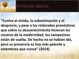 Este documento discute el rol de la agricultura familiar en América Latina y el Caribe. Aunque se predijo su desaparición, la agricultura familiar persiste y sigue siendo importante para la producción de alimentos y el empleo. El documento analiza los modelos de desarrollo pasados y actuales y su impacto en la agricultura familiar, así como los desafíos pendientes como revitalizar el estado y desarrollar políticas públicas multidimensionales que apoyen a la agricultura familiar.