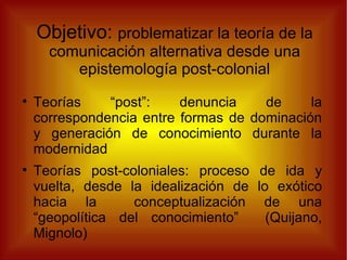 El documento explora la teoría de la comunicación alternativa mediante una perspectiva post-colonial, destacando la influencia de países del norte en la construcción del conocimiento en ciencias sociales y su efecto en el sur global. Se discuten contribuciones de teóricos como Gramsci y Freire, y se analizan contextos históricos que han influido en las prácticas de comunicación alternativa en América Latina y Europa. Además, se proponen estrategias para revitalizar el intercambio crítico y modalidades de conocimiento en estos campos.