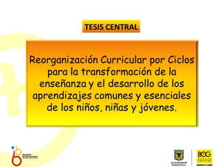 El documento presenta la reorganización curricular por ciclos en Bogotá, dividiendo la educación en etapas basadas en el desarrollo humano. Propone desarrollar herramientas para la vida a través de una base común de aprendizajes y una evaluación integral, dialógica y formativa de los estudiantes. El objetivo es mejorar la calidad educativa mediante la transformación de prácticas pedagógicas y la cultura institucional.