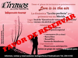 Este documento promueve los servicios de una agencia de citas llamada "La cita perfecta". Ofrecen eventos grupales donde las personas tienen citas cortas de 5 minutos para conocerse. Al final, los participantes indican con quién les gustaría volver a salir y la agencia coordina posibles coincidencias. También ofrecen membresías de diferentes niveles que incluyen más citas, beneficios y publicidad para negocios. El objetivo es ayudar a personas solteras a ampliar su círculo social y encontrar pareja de manera segura, econó