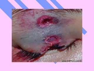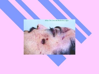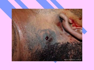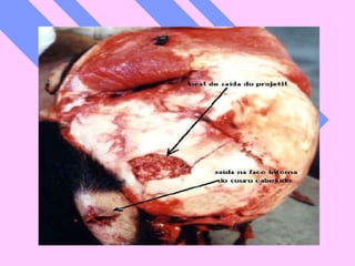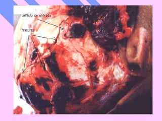 El documento describe las lesiones causadas por armas de fuego en Estados Unidos. Reporta que en 2002 murieron 2,867 niños estadounidenses por heridas de bala, lo que equivale a un niño cada tres horas. También describe las diferentes partes de un arma de fuego, los tipos de lesiones que causan en el cuerpo humano y cómo se pueden identificar a través del análisis de tatuajes, distancia de disparo y otras características.