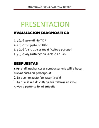 El documento presenta una evaluación diagnóstica realizada por Carlos Alberto Montoya Cureño sobre lo que aprendió, le gustó y se le dificultó en la clase de TIC, así como las cualidades y defectos que él mismo identifica. Carlos menciona haber aprendido a usar wikis y PowerPoint, haber disfrutado creando una wiki, y haber tenido dificultades con Excel. También promete esforzarse en la clase.