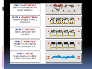 Este documento describe los conceptos clave relacionados con los niveles de capacidad y madurez en los modelos CMMI. Explica que existen 4 niveles de capacidad (incompleto, realizado, administrado y definido) para evaluar el progreso en una sola área de proceso, mientras que los 5 niveles de madurez (inicial, gestionado, definido, cuantitativo y optimizado) miden el progreso a través de múltiples áreas. También proporciona detalles sobre lo que se requiere para al