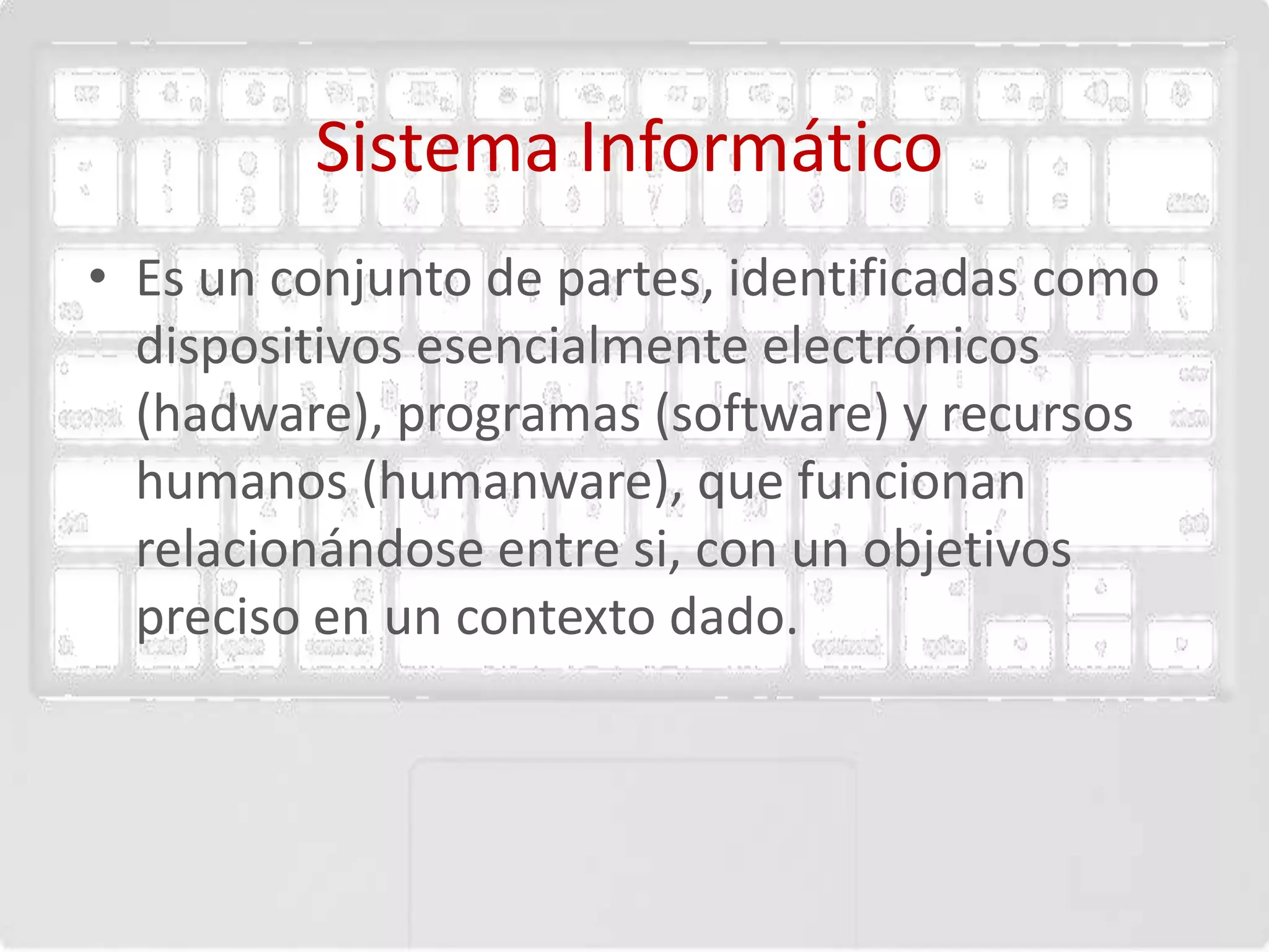 El documento describe los componentes principales de un sistema informático, incluyendo el hardware, software, firmware e infoware. Explica que el hardware se refiere a los dispositivos físicos como la CPU, memoria y periféricos, mientras que el software incluye programas y aplicaciones. También describe el proceso de entrada, procesamiento y salida de información en un sistema informático.
