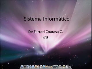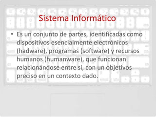 Este documento describe los componentes fundamentales de un sistema informático, incluyendo el hardware (dispositivos electrónicos), software (programas), y humanware (recursos humanos). Explica que el hardware se compone de dispositivos como la CPU, memoria, tarjetas y periféricos, mientras que el software incluye programas y firmware. También describe los procesos básicos de entrada, procesamiento y salida de información en un sistema informático.