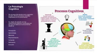 La psicología cognitiva estudia los procesos mentales relacionados con el conocimiento, centrando su análisis en mecanismos como percepción, aprendizaje y memoria. Entre los principales exponentes del cognitivismo se encuentran Jean Piaget, Jerome Bruner y Lev Vygotsky, quienes aportan teorías sobre la construcción del conocimiento y el aprendizaje. La teoría cognitiva enfatiza que el conocimiento es funcional y se desarrolla a través de la interacción social y experiencias personales.