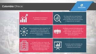 El documento presenta a Colombia como un destino atractivo para la inversión extranjera, destacando su economía dinámica y estable, diversas oportunidades de inversión en varios sectores, y su posición estratégica para acceder a mercados en América Latina a través de 10 acuerdos comerciales. Resalta el crecimiento económico sostenido de Colombia, su clase media en expansión, bajos niveles de deuda y grado de inversión, así como su posición como cuarta economía más grande de América