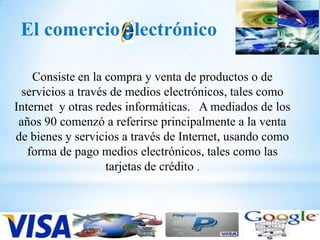 Este documento describe las características y tipos de comercio electrónico. Explica que el comercio electrónico involucra la compra y venta de productos y servicios a través de Internet u otras redes. Luego detalla los tipos B2B, B2C, B2A y C2A, y concluye resumiendo las características clave como la ubicuidad, alcance global, estándares, interactividad y personalización que ofrece el comercio electrónico.