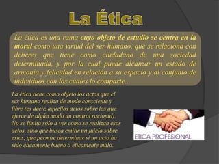Este documento presenta una discusión sobre la ética y los valores. Explica que la ética estudia los actos humanos voluntarios y busca determinar si son éticamente buenos o malos. Luego describe tres enfoques de la ética: la metaética, la normativa y la deontología. También define los valores como principios que guían el comportamiento humano y los clasifica en varias categorías como valores objetivos, subjetivos, universales e infrahumanos. Finalmente, enfatiza que los valores como la libertad, honestidad y respeto han estado presentes desde los or