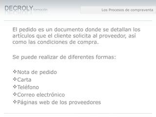 El documento describe los diferentes métodos para realizar pedidos, incluyendo nota de pedido, correo electrónico, carta y teléfono. Explica los datos que deben incluirse en una nota de pedido como el membrete, destinatario, número de pedido, fecha, artículos, plazo de entrega y condiciones de pago. También señala que el correo electrónico se usa comúnmente para enviar pedidos a través de Internet, y que aunque el teléfono es rápido, no queda un registro del pedido.