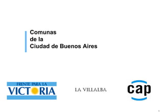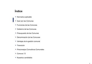 El documento proporciona información sobre las comunas de la Ciudad de Buenos Aires. Divide la ciudad en 15 comunas, cada una con su propio gobierno local llamado Junta Comunal. Las comunas tienen competencias exclusivas como mantenimiento urbano y espacios verdes, así como competencias concurrentes con el gobierno central en áreas como obras públicas y políticas sociales. Se llevarán a cabo elecciones en julio de 2011 para elegir a los miembros de cada Junta Comunal. La candidata presentada por nuestro partido para la Comuna 13 es María Eug