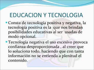 El documento discute las tecnologías positivas y negativas en la educación, destacando que la radio, el cine, la prensa y la informática pueden usarse de manera apropiada para apoyar la enseñanza al fomentar la libertad de expresión, participación, actitud crítica y aprendizaje motivador, mientras que el uso excesivo de la tecnología puede conducir a una confianza desproporcionada y falta de comprensión.