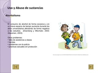 El documento habla sobre el consumo de sustancias psicoactivas (SPA) en adolescentes. Explica que la etapa adolescente es de mayor riesgo para iniciar el consumo de SPA y que este puede traer consecuencias negativas como fracaso académico e irresponsabilidad. También menciona factores de riesgo como tener amigos que consumen tabaco y no sentir apoyo de los padres. Finalmente, destaca que el consumo de drogas inyectables aumenta el riesgo de VIH/Sida y que los niños y adolescentes experimentan con sust