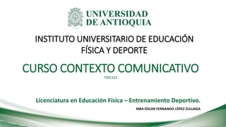 Este documento presenta la información sobre un curso llamado "Contexto Comunicativo" impartido por el MBA Óscar Fernando López Zuluaga. El curso explora cómo la comunicación contribuye a los procesos formativos de los estudiantes de educación física y entrenamiento deportivo. El curso cubre temas como los procesos de comunicación, la formación e interacción comunicativa, el lenguaje corporal y la expresión, y el reconocimiento de problemáticas de comunicación en la educación física. Los estudiantes completarán varias actividades