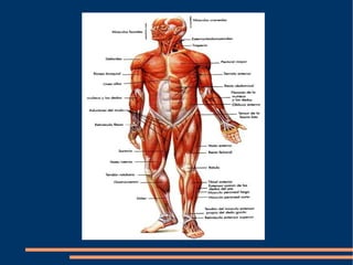 El documento habla sobre los huesos, articulaciones y músculos del cuerpo humano. Explica que los huesos forman el esqueleto interno y se unen en las articulaciones, las cuales permiten doblar el cuerpo en el cuello, hombros, cintura, codos, muñecas, rodillas y tobillos. Además, señala que los músculos se encuentran debajo de la piel, recubren el esqueleto y se unen a los huesos a través de los tendones.