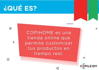 Este documento presenta COPIHOME, una tienda online que permite a los clientes personalizar productos gráficos, de comunicación y merchandising en tiempo real. COPIHOME está dirigida a clientes que buscan comprar este tipo de productos de forma sencilla y ágil, pudiendo visualizar y editar diseños al instante y recibir una prueba de impresión en línea. El proceso de compra en COPIHOME implica registrarse en su sitio web, seleccionar un producto para personalizar, agregarlo al carrito de compras, revisar los