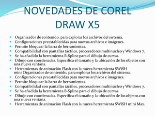 El documento describe las nuevas características de CorelDRAW X5, incluyendo un organizador de contenido, configuraciones preestablecidas para archivos e imágenes, compatibilidad con pantallas táctiles y Windows 7, una herramienta B-Spline para dibujar curvas, dibujo con coordenadas, y herramientas de animación Flash. También explica cómo iniciar y cerrar CorelDRAW X5 y describe los componentes principales de la pantalla inicial como la barra de título, barras de menús y barras de herramientas.