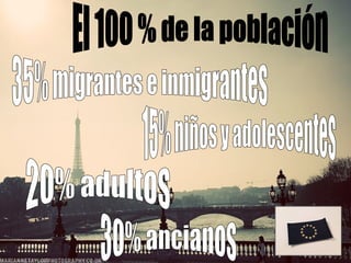 El documento describe el envejecimiento de la población en la Unión Europea, donde el 40% de las personas tienen más de 65 años, la tasa más alta en el mundo. Esto se debe a que las personas viven más tiempo y las tasas de natalidad son más bajas, con menos hijos y matrimonios que duran menos. Además, debido a las oportunidades laborales, Europa tiene gran diversidad social e inmigración, lo que a veces genera xenofobia por el temor a perder puestos de trabajo.