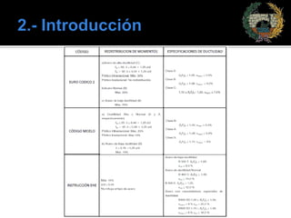 El documento resume conceptos clave sobre la ductilidad del acero de refuerzo y su relación con la corrosión. Define el concepto de "acero equivalente" para cuantificar la ductilidad mediante dos parámetros y analiza cómo la pérdida de ductilidad debido a la corrosión puede afectar el comportamiento de las estructuras de hormigón armado.
