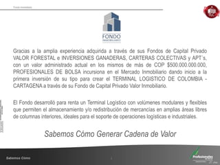 El documento describe un fondo inmobiliario que está desarrollando un terminal logístico en Cartagena, Colombia. El fondo tiene un valor de $160,500 millones y ofrece una tasa interna de retorno estimada del 16.39%. El terminal logístico tendrá un área total de 102,322 metros cuadrados y contará con naves logísticas, locales comerciales, oficinas y un hotel. El fondo espera aprovechar la ubicación estratégica de Cartagena para el comercio internacional.