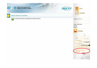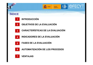 El documento describe el sistema de evaluación de revistas científicas españolas por parte de la Fundación Española para la Ciencia y la Tecnología (FECYT), incluyendo objetivos, características, indicadores y fases de la evaluación. Se presenta un enfoque hacia la automatización de procesos, destacando ventajas como la fluidez del proceso y el registro de comunicaciones. La evaluación se basa en criterios de calidad, originalidad y cumplimiento de requisitos editoriales, con la participación de expertos en el campo.